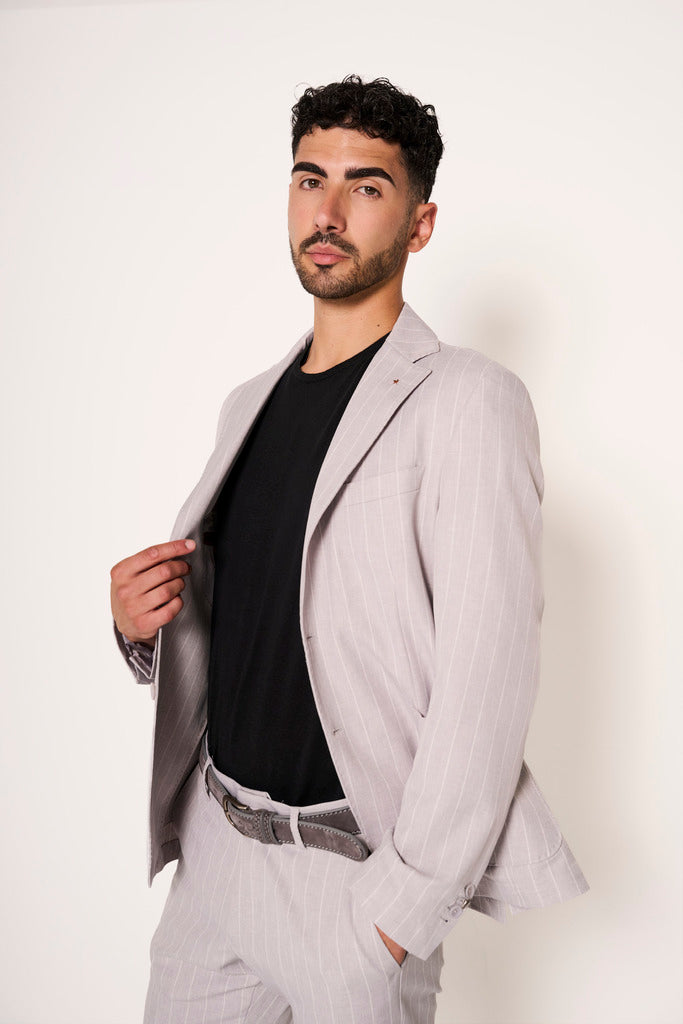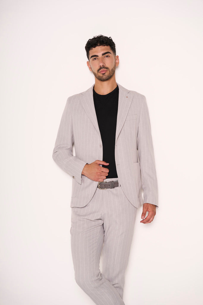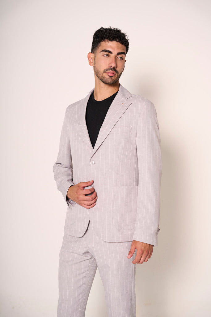 Elegante e moderno, questo abito uomo slim fit grigio chiaro con sottili righe gessate è la scelta ideale per look formali dal tocco contemporaneo. La giacca presenta una mezza fodera interna che garantisce leggerezza e comfort, chiusura a 2 bottoni, 2 spacchi posteriori per una vestibilità dinamica e 2 tasche a toppa dal design essenziale. Il pantalone è realizzato senza pences per un taglio pulito e asciutto, con pratiche tasche americane laterali. Perfetto da abbinare a una t-shirt per un outfit smart casual o a una camicia per le occasioni più formali.