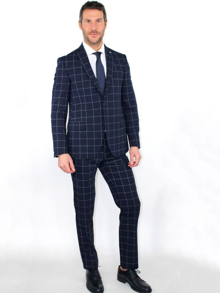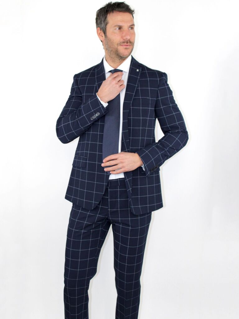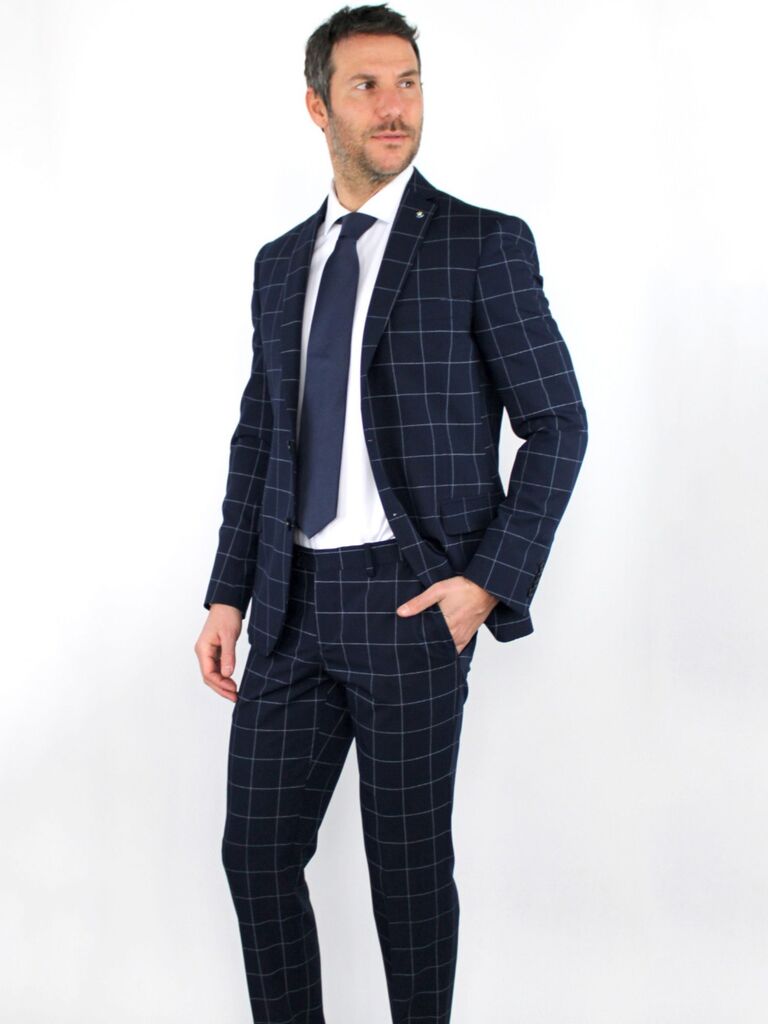 DESCRIZIONE: Abito riquadrato vestibilità slim con giacca a chiusura con due bottoni, tasche a pattine e applicazione sul colletto. Composizione: 72% poliestere, 23% viscosa Codice prodotto: 256801