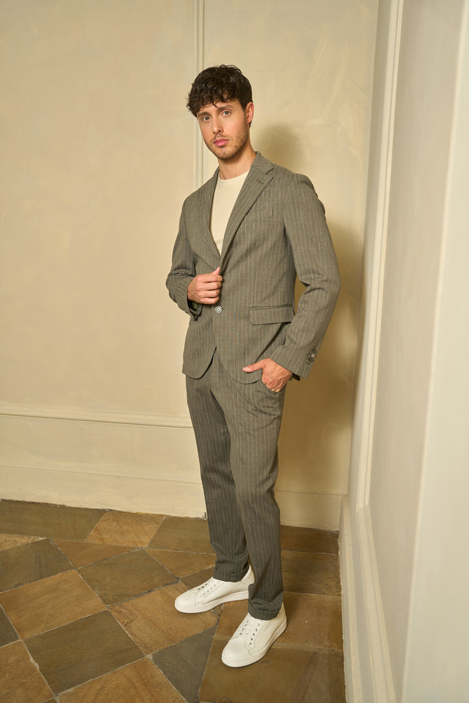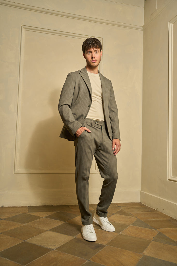 Completo due pezzi con fantasia gessata, composto da giacca monopetto con rever classico e pantalone coordinato a vita regolare. La giacca presenta mezza fodera interna, ed è completata da chiusura a due bottoni e spacchi laterali. Il pantalone ha chiusura con bottone e zip nascosta.