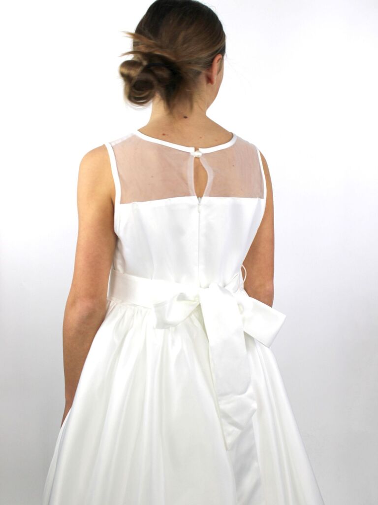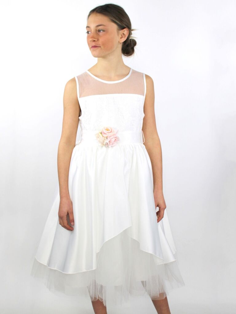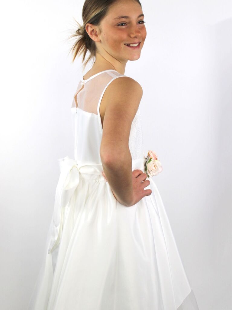 DESCRIZIONE: Abito ampio con tulle, a girocollo con cintura con fiori rosa e fiocco dietro, chiusura dietro con un bottone gioiello e zip Composizione:100% poliestere Codice prodotto:257749