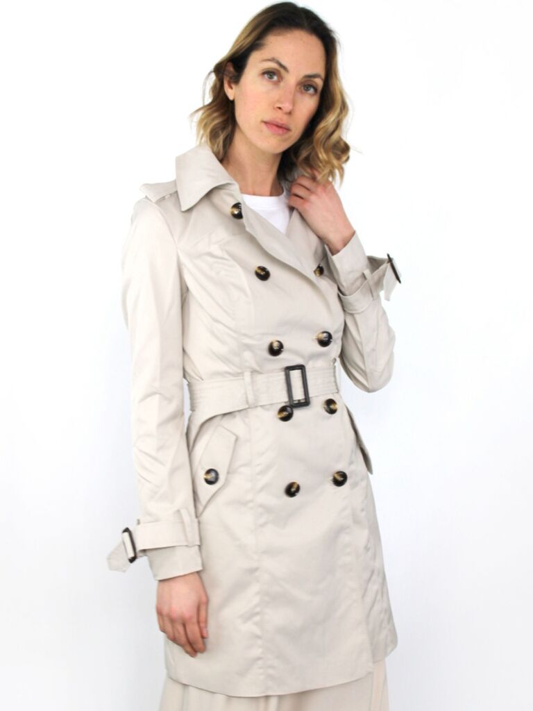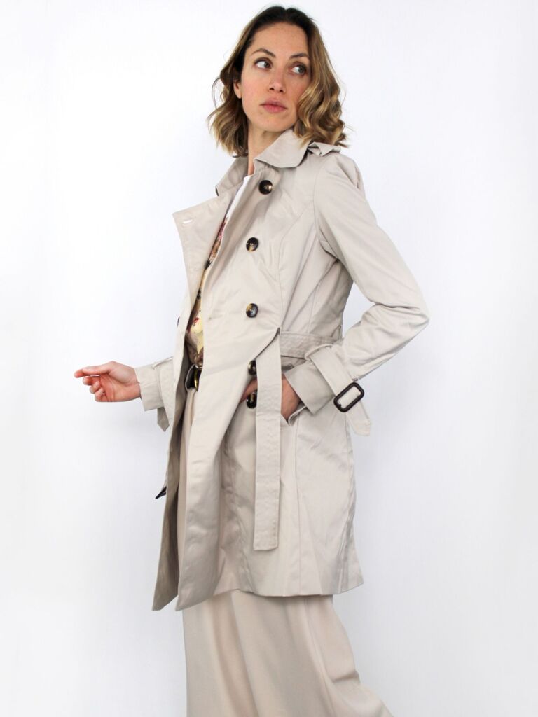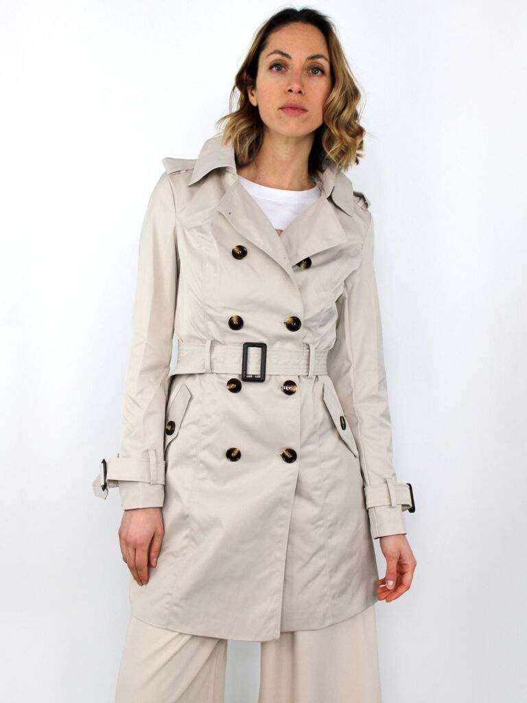 DESCRIZIONE: Trench in tessuto impermeabile, doppiopetto, con cintura in vita e fibbie sulle maniche, tasche a pattina con bottone Composizione: 100% poliestere Codice prodotto: 256998