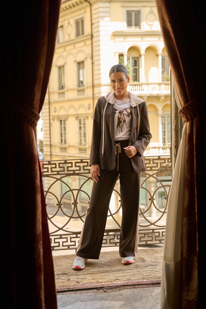 DESCRIZIONE: Pantalone dalla linea morbida e confortevole. Vita elasticizzata con coulisse regolabile, gamba larga con bande laterali a contrasto che slanciano la figura. Un modello versatile e contemporaneo, perfetto per un look casual ma curato. CODICE PRODOTTO: 260430