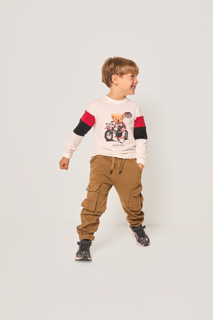 DESCRIZIONE: T-shirt a maniche lunghe in cotone con divertente stampa frontale “Street Rider”. Il modello presenta bande colorate a contrasto sulle maniche e vestibilità regolare. Codice prodotto: 258381