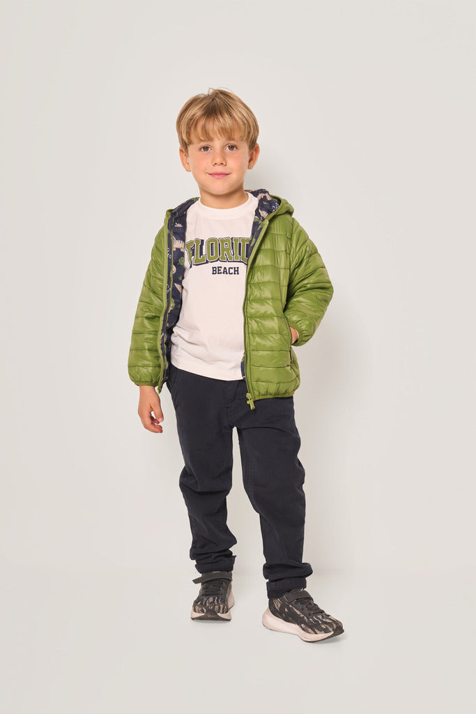 Piumino leggero con cappuccio, perfetto per la mezza stagione. Un lato in tinta unita verde brillante e l’altro con divertente stampa a dinosauri. Imbottitura calda e leggera, chiusura con zip e tasche laterali.