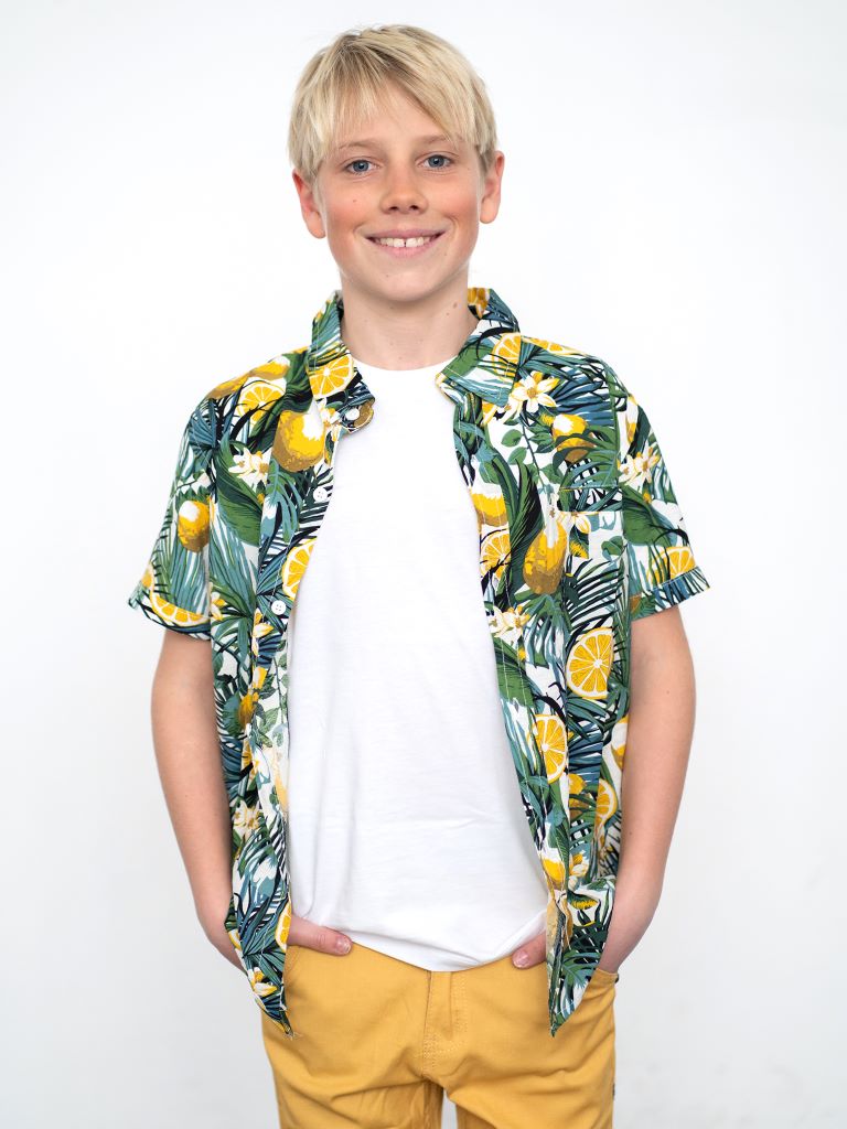 Camicia con colletto a revers e maniche corte. Chiusura con abbottonatura anteriore