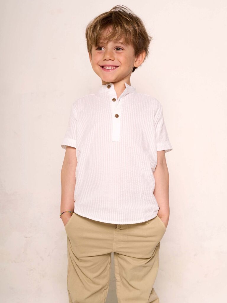 Camiciotto bimbo collo coreano, mezza abbottonatura, tessuto goffrato.