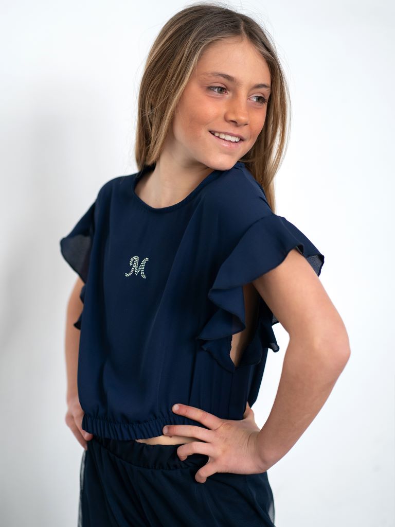 Blusa cropped con elastico fondo. Maniche corte con volant e dettaglio di strass frontale