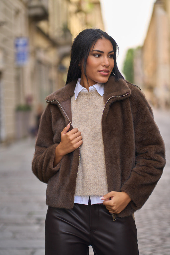 DESCRIZIONE: Giacca in morbida ecopelliccia dal design moderno e avvolgente. Dotata di chiusura con zip frontale e collo listino, un dettaglio che dona un tocco elegante e contemporaneo. CODICE PRODOTTO: 259635