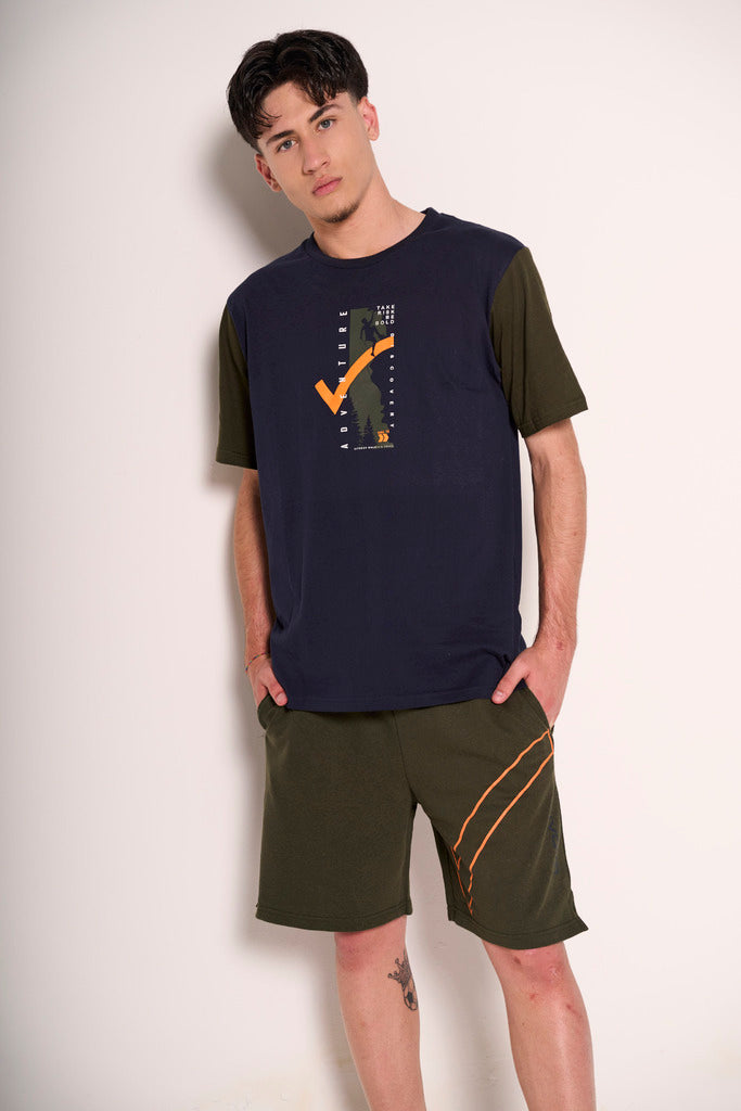 Completo sportivo da uomo composto da t-shirt e bermuda coordinati. La t-shirt presenta un design bicolore con maniche verde militare e corpo blu navy, arricchita da una grafica verticale arancione dal look urban e dinamico. I bermuda in tinta verde militare con cuciture arancioni a contrasto offrono una vestibilità comoda e leggera, ideale per il tempo libero, lo sport o le giornate estive all’aperto. Realizzato in morbido jersey traspirante, è la scelta perfetta per chi cerca stile e praticità in un solo capo. Disponibilr anche con colorazione bianco-blu.