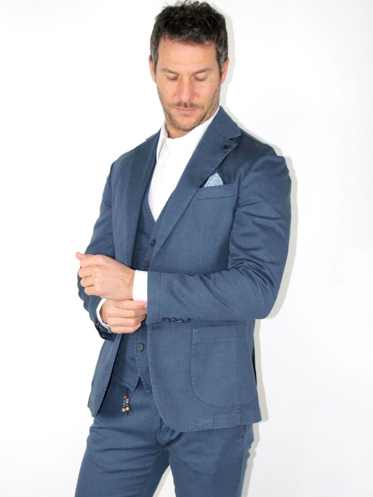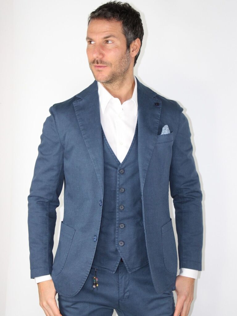 DESCRIZIONE: Giacca con chiusura a 2 bottoni, taschino sul petto e tasche applicate a toppa Composizione: 98% cotone, 2% elastan Codice prodotto: 256406