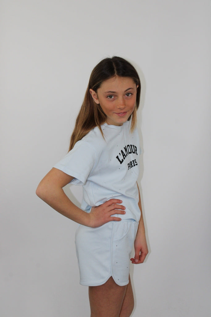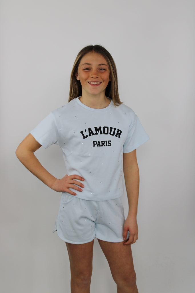 DESCRIZIONE: Completo da bambina 2 pezzi. T-shirt girocollo con scritta frontale al centro e strass vari. Pantaloncino corto con strass e due tasche laterali. Composizione: 80% cotone, 20% poliestere Codice prodotto: 258298
