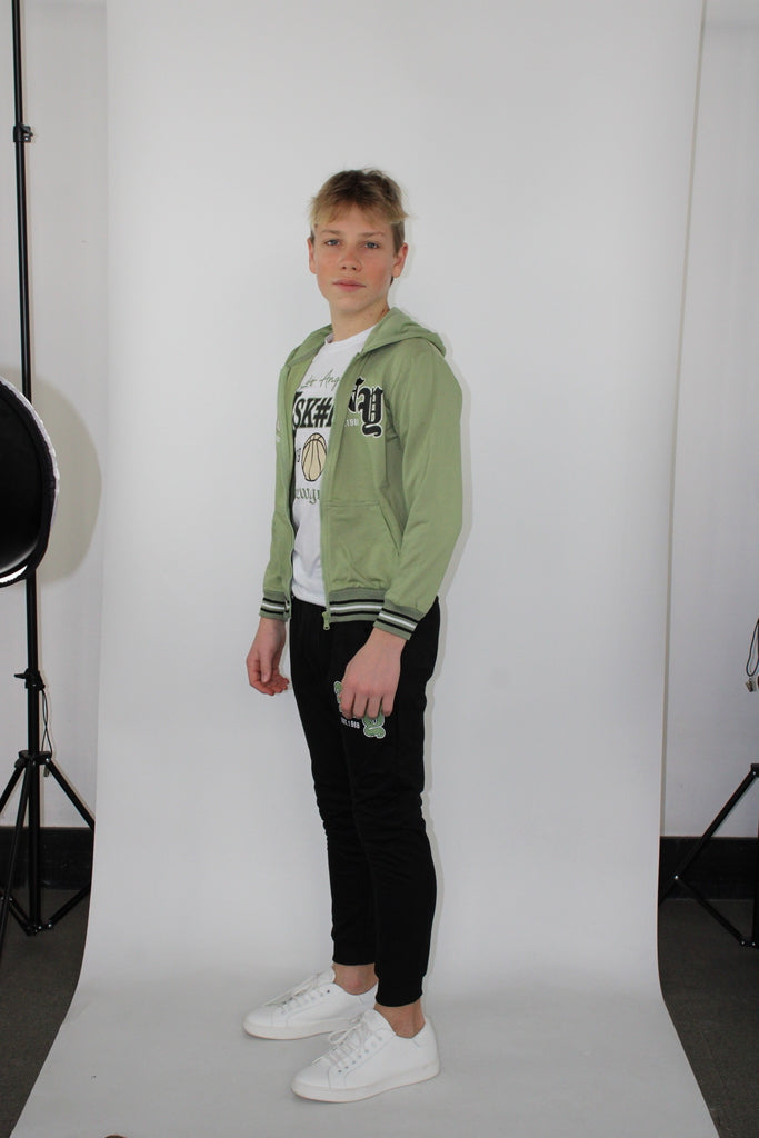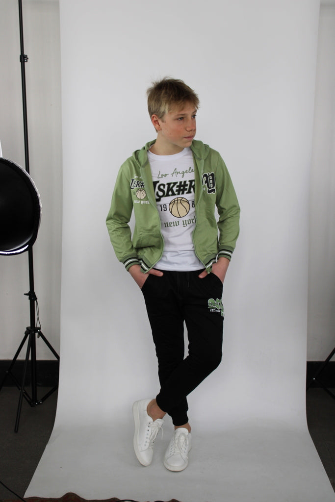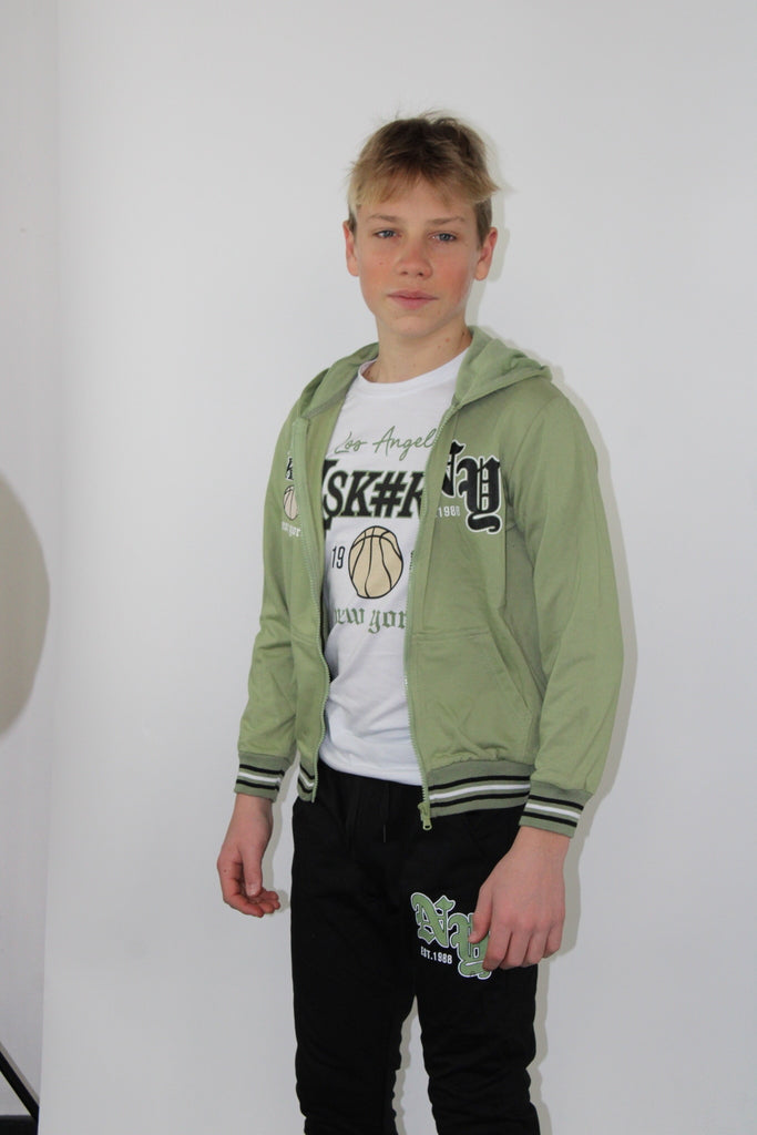 Completo 3 pezzi da bambino in tema basket. Felpa con cappuccio, zip, elastico in vita e polsi, stampa frontale. T-shirt girocollo, mezze maniche, stampa frontale. Pantaloni lunghi con elastico in vita e caviglie.