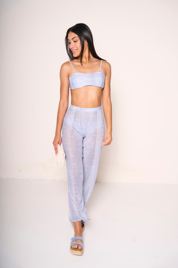 Scopri il completo perfetto per brillare sotto il sole: questo set 3 pezzi include un bikini azzurro con top a fascia con strass e slip classico, accompagnato da un pantalone copricostume trasparente in coordinato. La tonalità celeste esalta l’abbronzatura, mentre il pantalone ampio e leggero dona movimento e femminilità al look. Il mix di sensualità e comfort lo rende ideale per la spiaggia, la piscina o un pool party super chic. Un solo acquisto, tre capi pronti a farti risplendere.