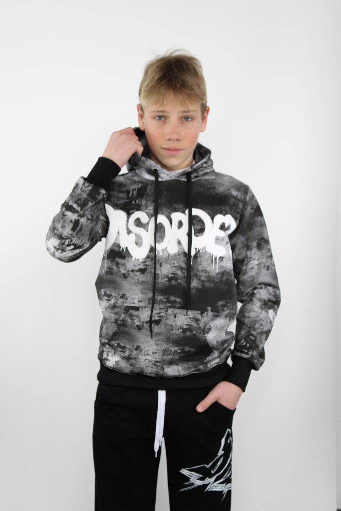 DESCRIZIONE: Felpa da bambino con cappuccio, tasche laterali, fantasia e colori grigio-neri, elastico in vita e ai polsi, scritta "disorder" frontale al centro. Composizione: 90% cotone, 10% poliestere Codice prodotto: 257632