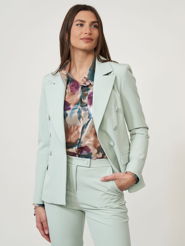 Giacca doppiopetto con bottoni in tinta, foderata. Tasche a pattina.