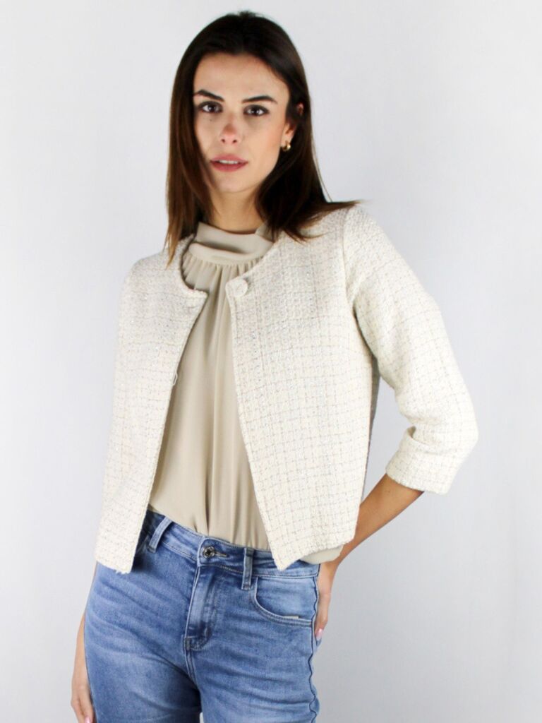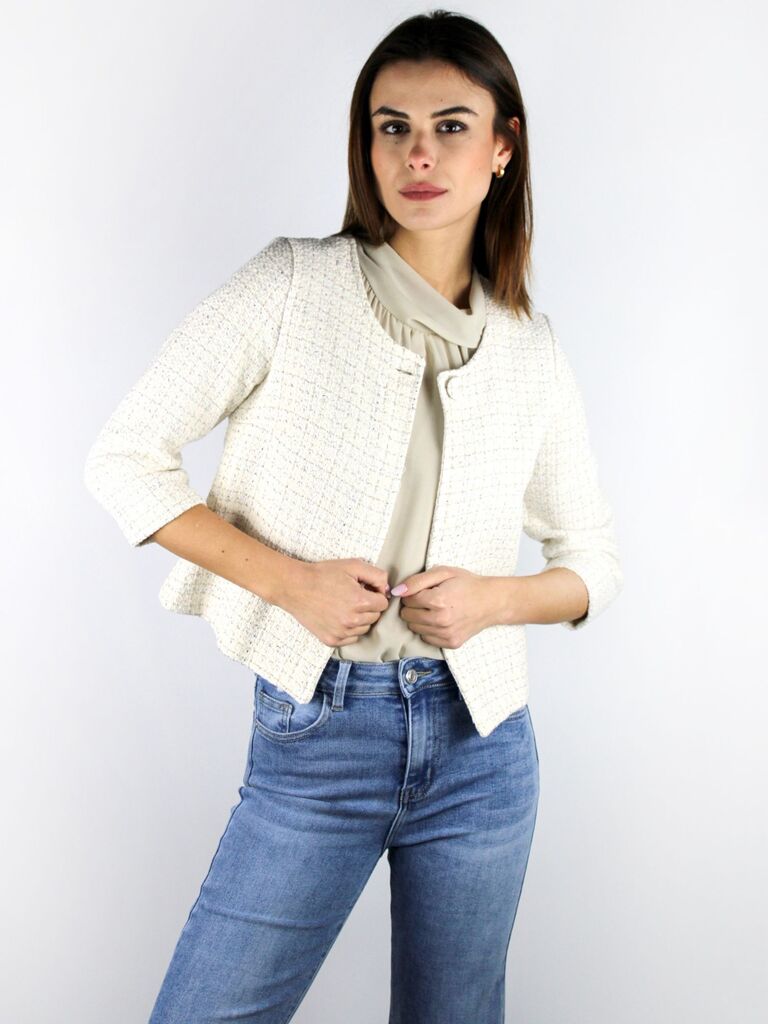 DESCRIZIONE: Giacca corta in microfantasia con chiusura a bottoni e maniche a tre quarti. Composizione: 65% viscosa,32% nylon,3% af Codice prodotto: 257687
