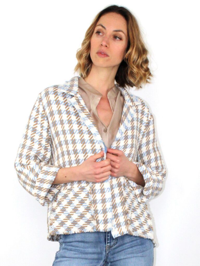 Giacca in fantasia senza bottoni, con tasche e maniche con risvolto