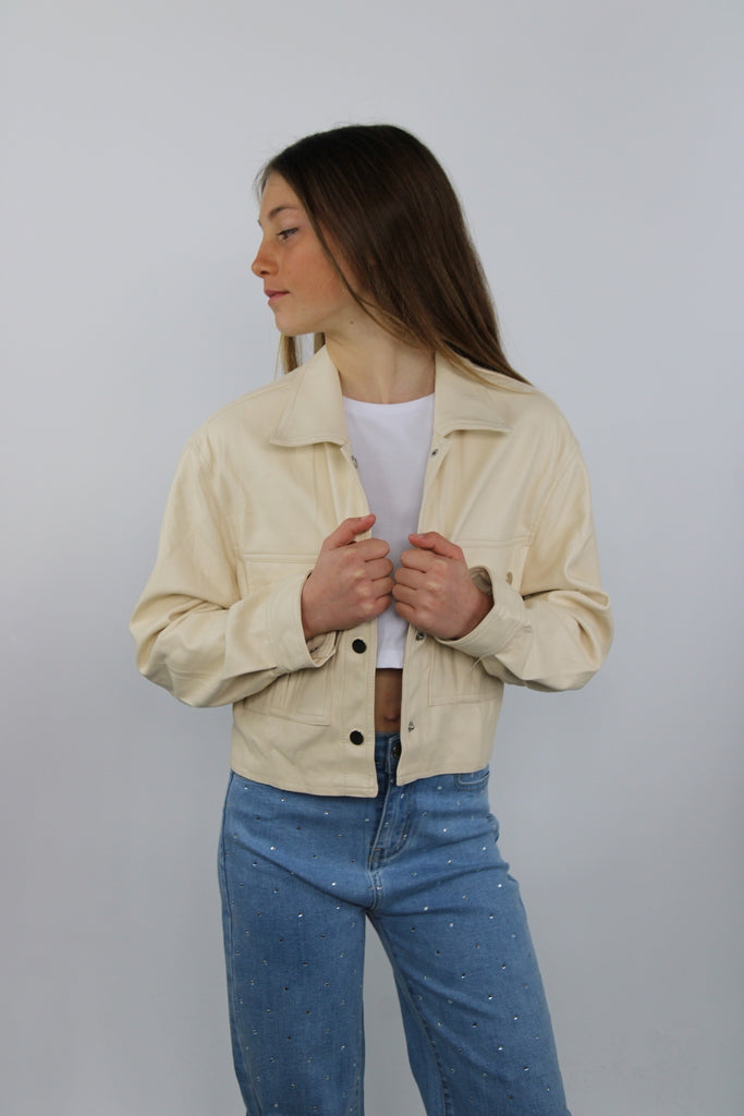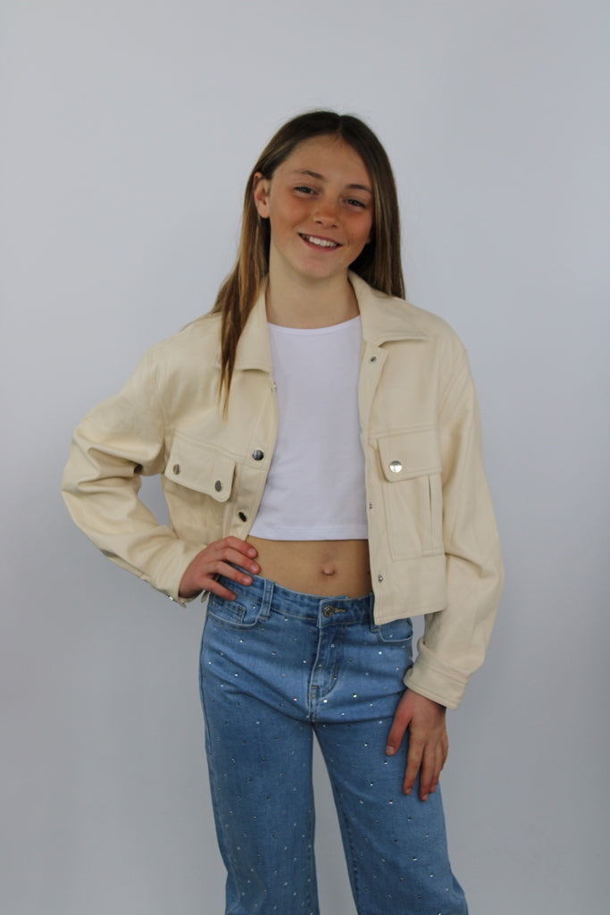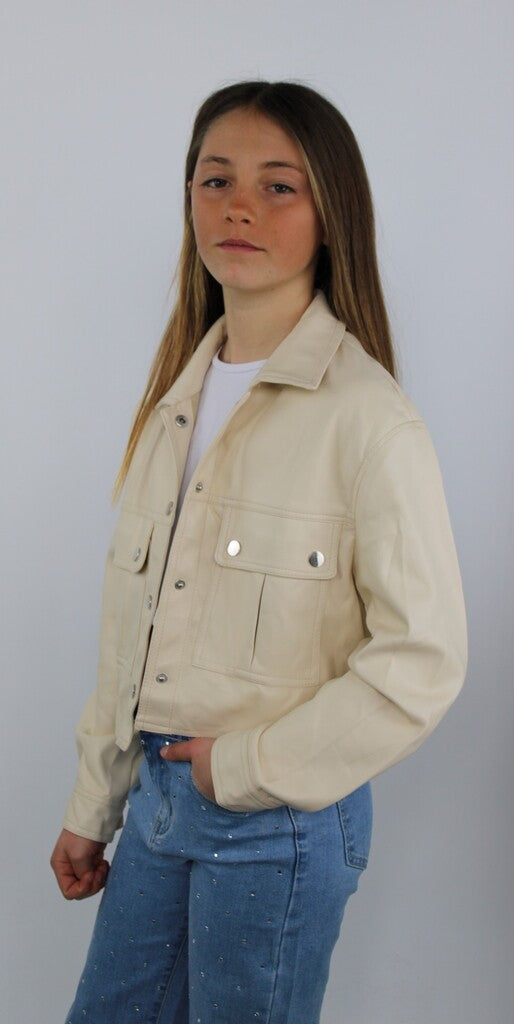 Giubbottino corto da ragazza in ecopelle color panna, dal design moderno e minimal. Il modello presenta una chiusura frontale con bottoni metallici a pressione e due tasche applicate sul petto con patta e bottone decorativo. Il taglio cropped e il tessuto lucido donano un tocco contemporaneo e grintoso, perfetto per completare look casual-chic.