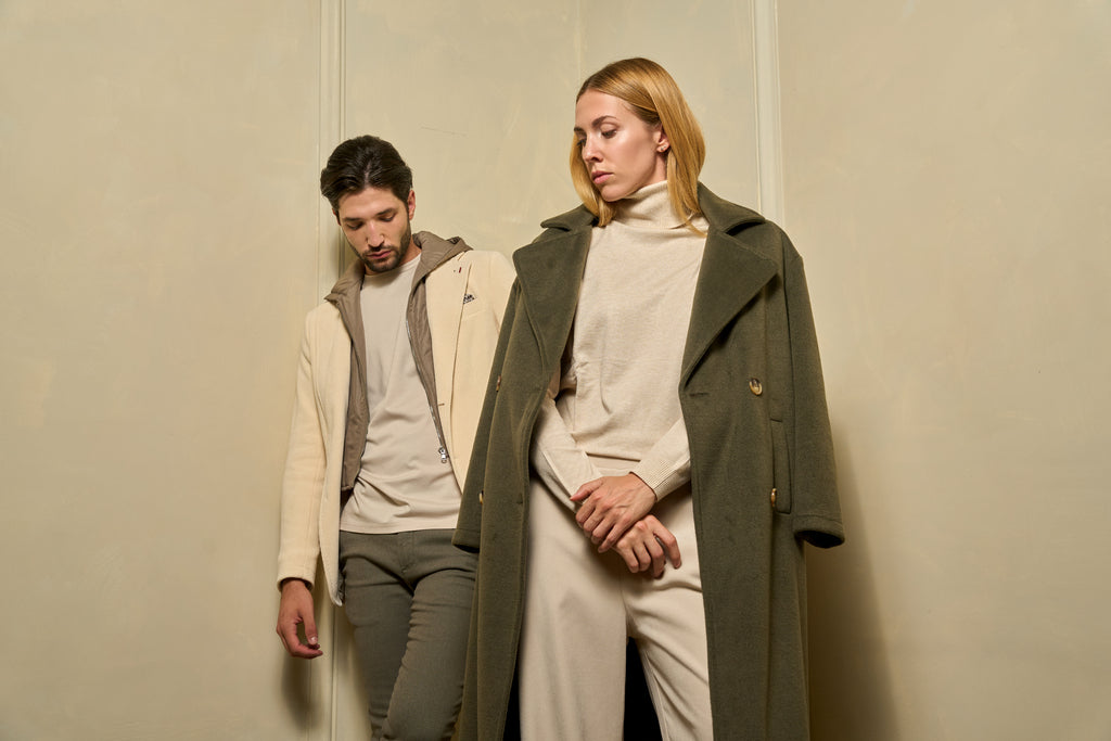 Cappotto lungo presenta chiusura doppiopetto con bottoni, revers ampi e tasche laterali a filetto.