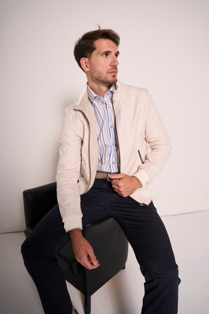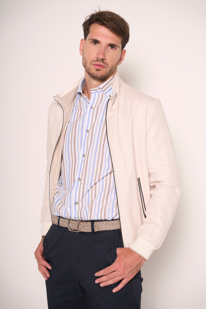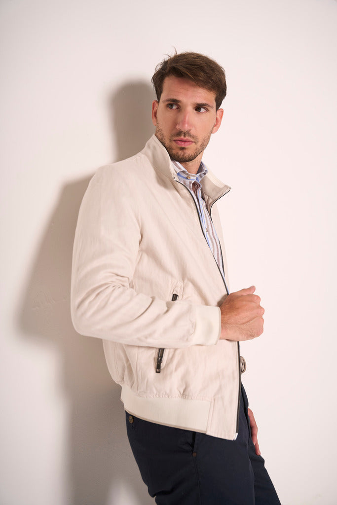 Giubbotto dal design essenziale e contemporaneo, perfetto per la mezza stagione. Realizzato in tessuto leggero e traspirante, presenta una chiusura frontale con zip e pratiche tasche laterali con chiusura a zip. Inoltre su collo, polsi e fondo il tessuto è in maglia elasticizzato. Il taglio regolare garantisce comfort e libertà di movimento, rendendolo ideale per completare outfit casual con un tocco urbano.