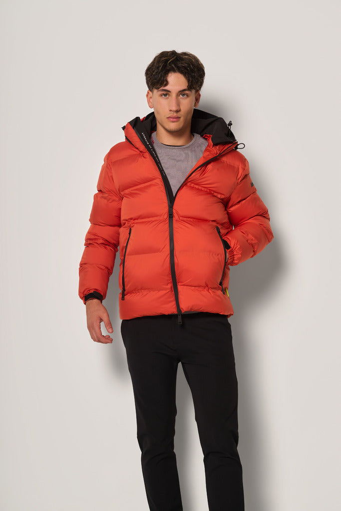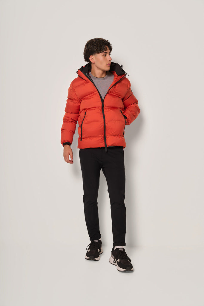 Piumino imbottito che garantisce un eccellente isolamento termico, mentre la linea moderna e il colore ruggine acceso donano un tocco contemporaneo. Il cappuccio regolabile e i polsini elasticizzati assicurano una protezione ottimale da vento e basse temperature. Dotato di zip a contrasto e tasche laterali chiuse.