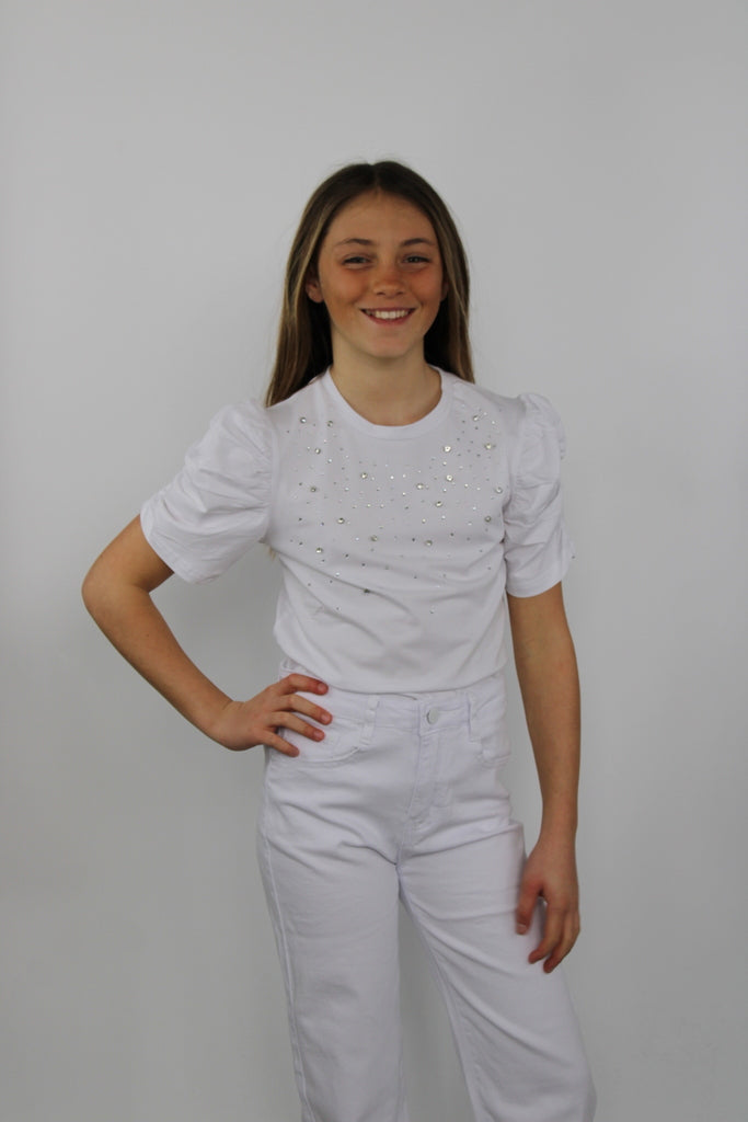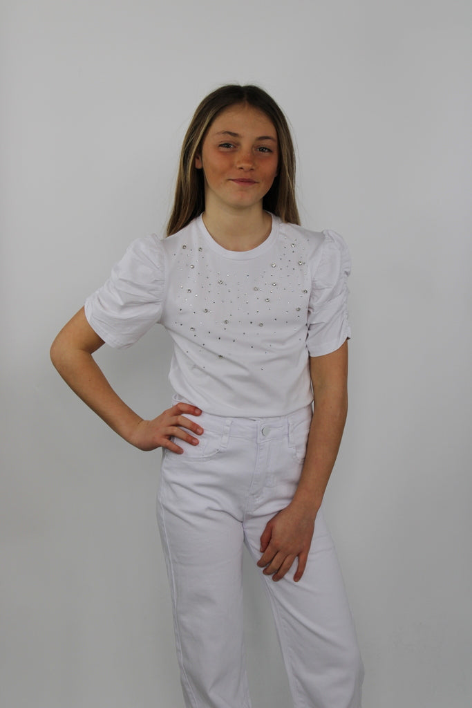 T-shirt bianca da ragazza a maniche corte con spalle arricciate e leggero effetto a sbuffo, che dona volume e un tocco romantico. Il davanti è impreziosito da una cascata di piccoli strass argentati che aggiungono luminosità e raffinatezza al capo. Il taglio è classico, con girocollo e linea dritta.
