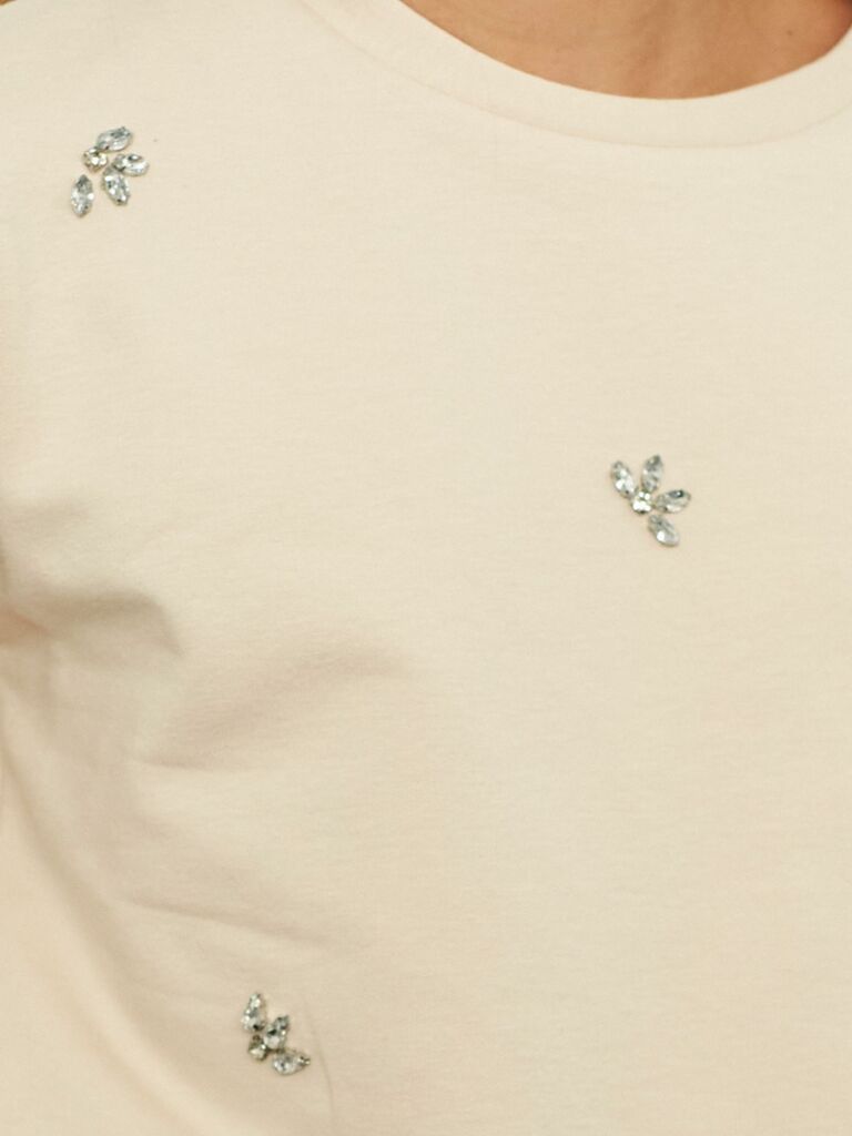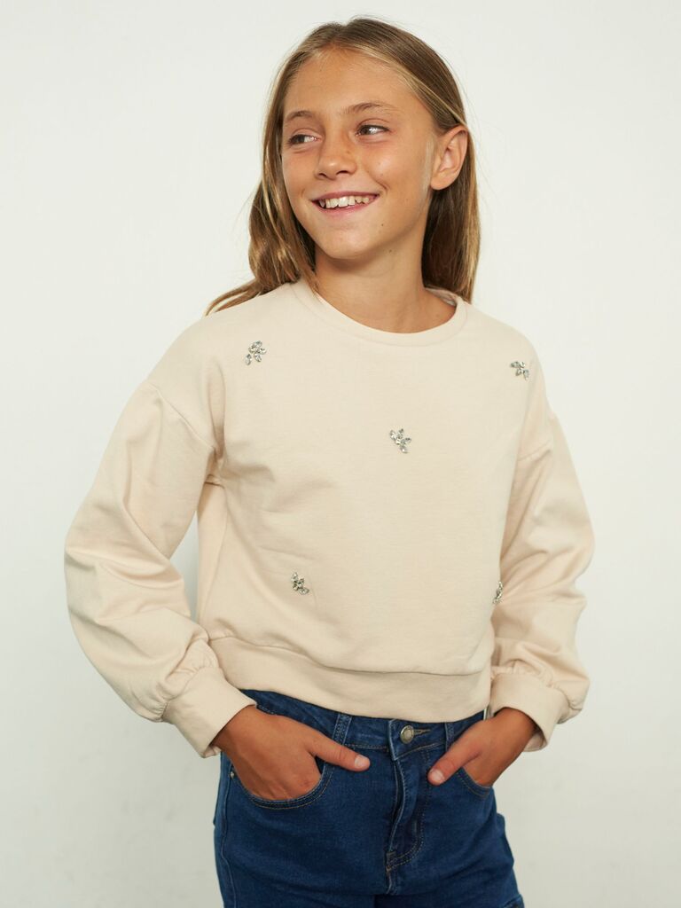 Maglia con maniche a sbuffo e applicazioni di strass a formare dei fiorellini brillantinati