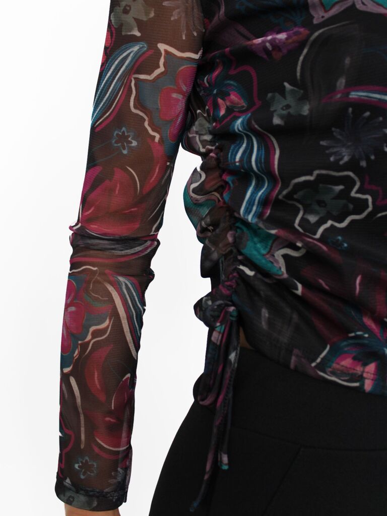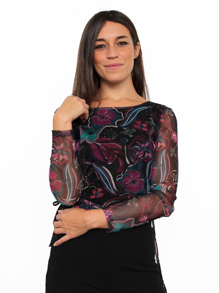 DESCRIZIONE Maglia girocollo tutta in fantasia floreale di tulle, maniche semitrasparenti, arriccio sui fianchi con cordino Composizione: tulle Codice prodotto: 248446