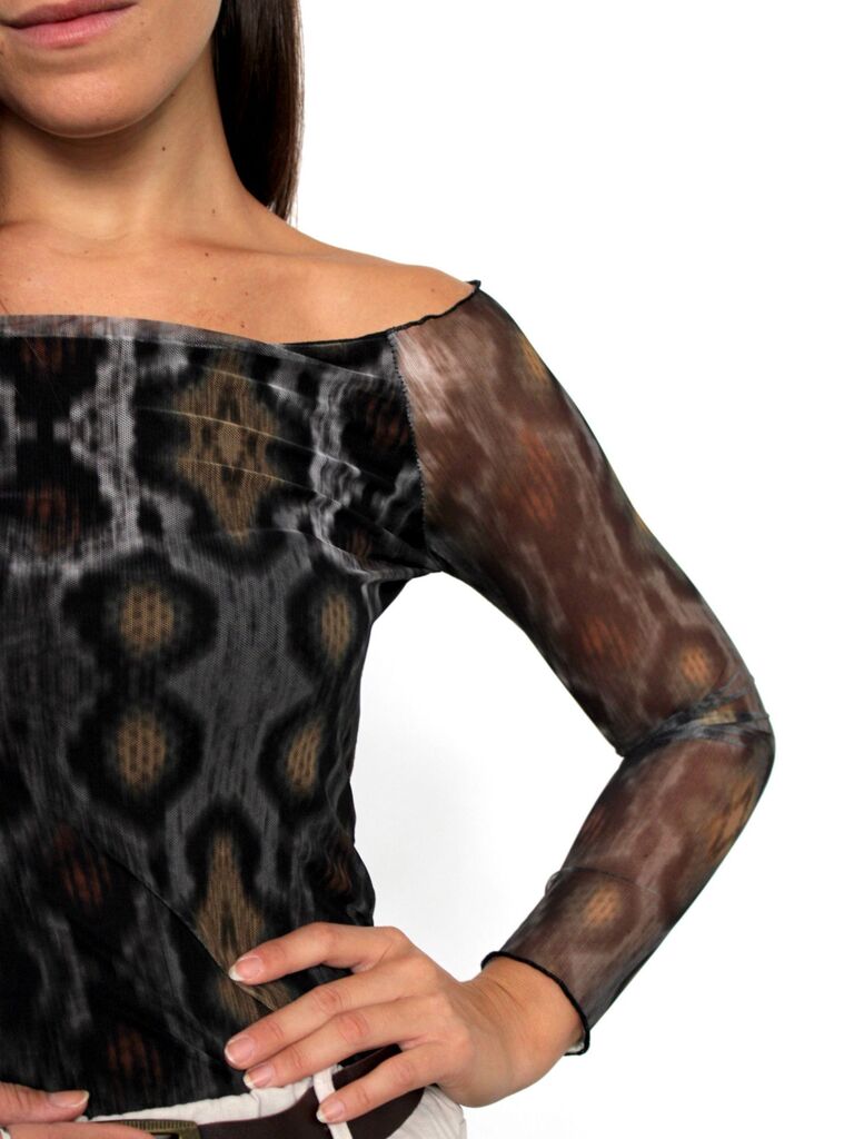 DESCRIZIONE Maglia con scollo a barchetta, tutta in fantasia animalieri di tulle, maniche semitrasparenti Composizione: 100% tulle Codice prodotto: 248448