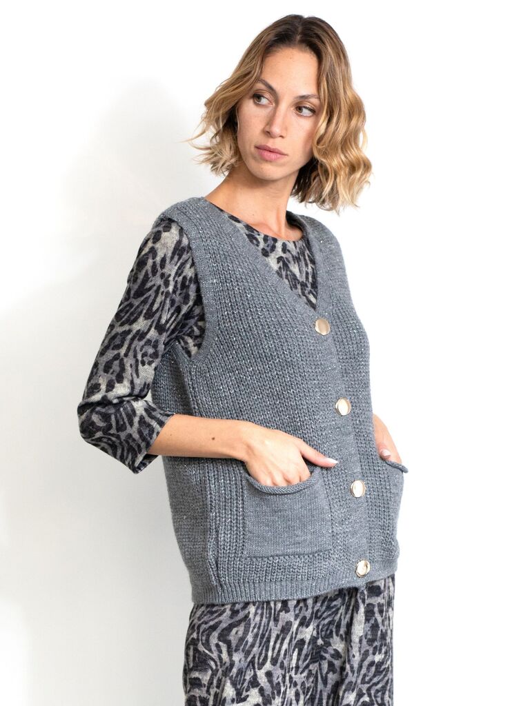 Gilet in maglia lavorato, tutto in lurex con scollo a V. Bottoni oro e taschini applicati a toppa