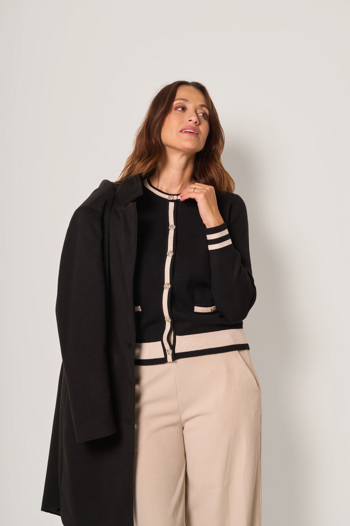 DESCRIZIONE: Maglia fine dal design bon ton con profili a contrasto color panna.Il modello, caratterizzato da una linea dritta e femminile, presenta una chiusura frontale con bottoni gioiello e taschine decorative con dettagli coordinati. Codice prodotto: 259335