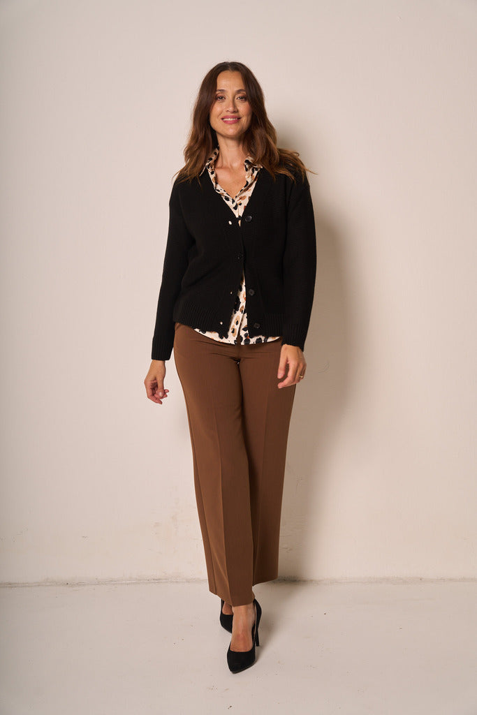 DESCRIZIONE: Cardigan dal design classico e versatile, realizzato in morbida maglia a costine. Il modello presenta scollo a V, chiusura frontale con bottoni tono su tono e finiture a costine su polsini e fondo. Codice prodotto: 259788