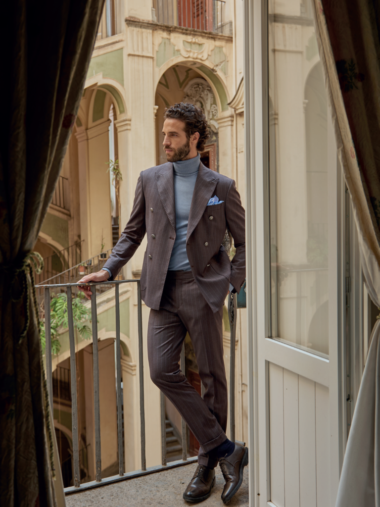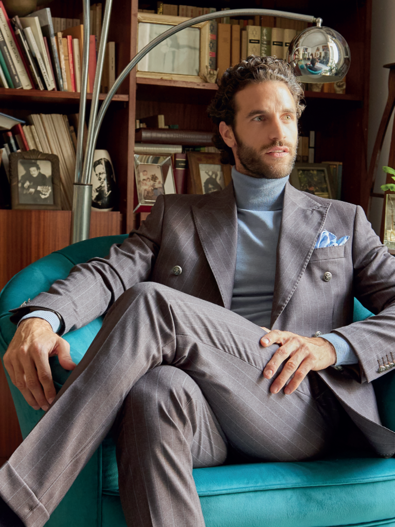 Abito doppiopetto rappresenta il massimo dell’eleganza maschile contemporanea. Realizzato in un pregiato tessuto gessato, offre una vestibilità impeccabile che valorizza con naturalezza la linea del corpo. La giacca doppiopetto, dal taglio sartoriale, presenta revers a lancia, bottoni metallici e una struttura che unisce classicità e modernità. Il pantalone coordinato, con linea affusolata, completa il look con equilibrio e sobria ricercatezza.