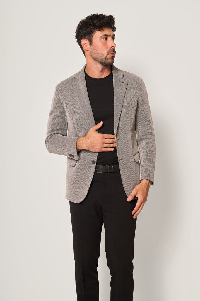 La giacca grigia a micro disegno è il capo perfetto per uno stile moderno e raffinato. Realizzata in misto lana stretch, unisce comfort e vestibilità impeccabile, adattandosi perfettamente alle esigenze dell’uomo contemporaneo.Il tessuto presenta una micro fantasia tono su tono che dona profondità e personalità, mantenendo al contempo un’eleganza sobria e pulita. Il taglio semi-sartoriale con revers classico, tasche con patta e chiusura a due bottoni la rendono ideale sia per look casual con t-shirt, sia per outfit più formali con camicia.
