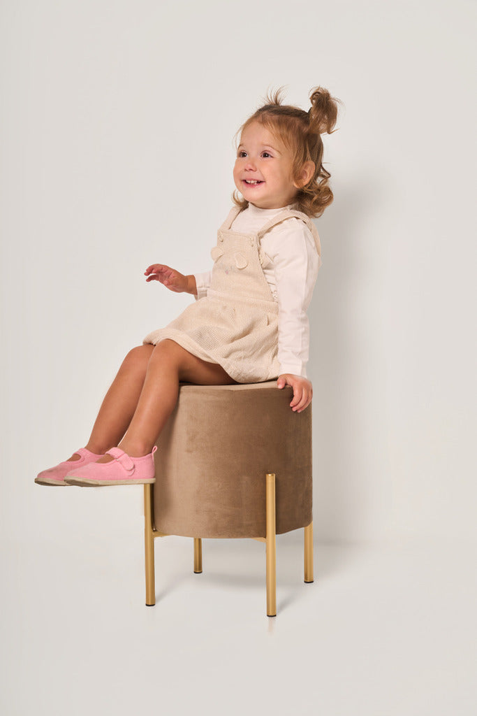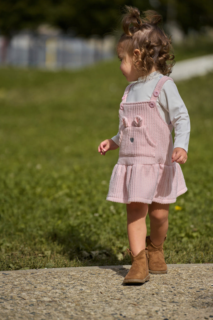 Completo da neonata composto da maglia a maniche lunghe, con pratici bottoncini automatici sulla spalla per facilitare la vestizione, e salopette in velluto con gonnellina svasata. Le bretelline regolabili con bottoni presentano un dolce ricamo con faccina di animaletto, arricchito da orecchiette applicate che donano un tocco giocoso.