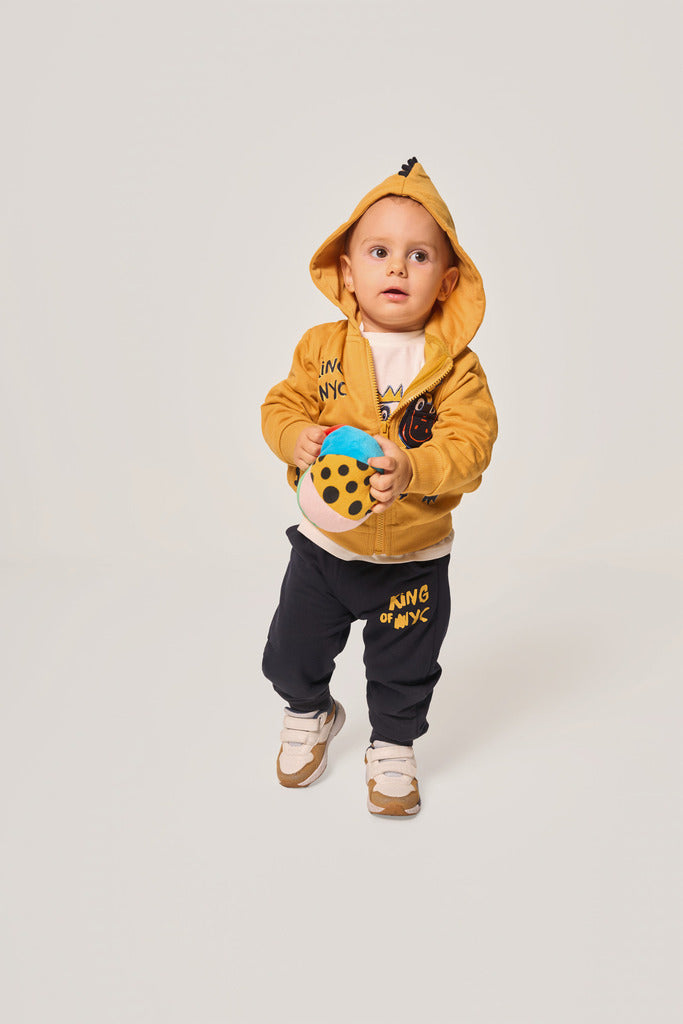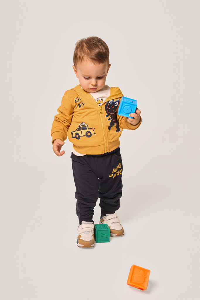 Completo 3 pezzi ispirato alla città che non dorme mai!Il set include:- Felpa con cappuccio color senape, con stampa “King of NYC” e dettagli giocosi sul cappuccio;- T-shirt a maniche lunghe in cotone, con grafica coordinata di dinosauro e taxi;-Pantaloni jogger blu navy con scritta stampata e vita elasticata per il massimo comfort.Realizzato in morbido cotone.