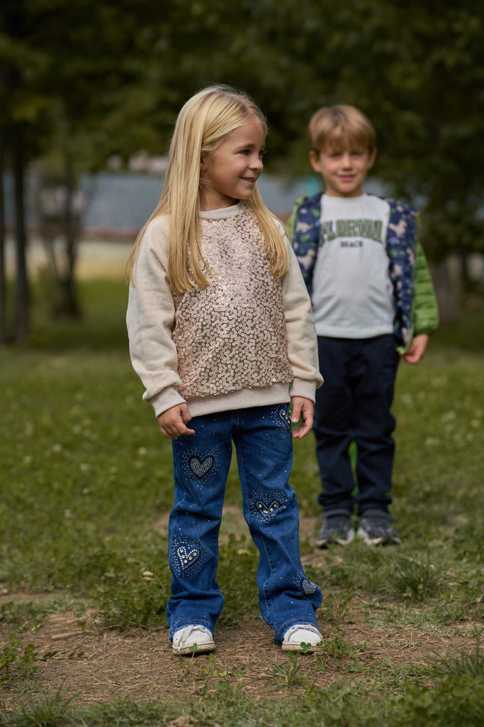 DESCRIZIONE: Felpa a maniche lunghe con fronte interamente ricoperto di paillettes, che donano un tocco luminoso e alla moda. Collo, polsini e fondo elasticizzate per una vestibilità confortevole. CODICE PRODOTTO: 260331