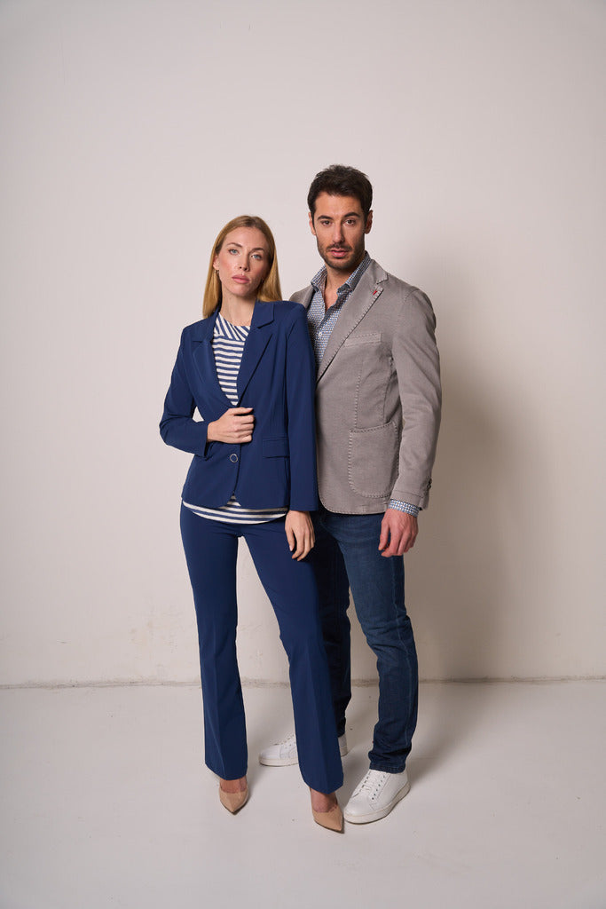 Blazer donna blu dal design elegante e femminile, pensato per valorizzare la silhouette con una linea pulita e ben strutturata.La vestibilità moderna lo rende ideale sia per look professionali che per abbinamenti più casual chic. Perfetto coordinato al pantalone della stessa linea per un completo raffinato, oppure indossato con jeans e t-shirt per uno stile contemporaneo e versatile.Un capo essenziale, curato nei dettagli, pensato per accompagnarti con stile in ogni momento della giornata.