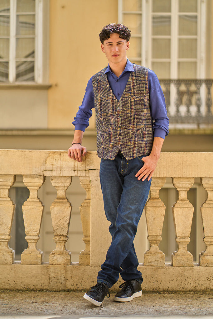 DESCRIZIONE: Gilet da uomo in tessuto a quadri, modello unito con scollo a V e chiusura frontale con bottoni. Dotato di pratiche tasche frontali applicate e fibbia regolabile sul retro per una vestibilità personalizzata. CODICE PRODOTTO: 260057