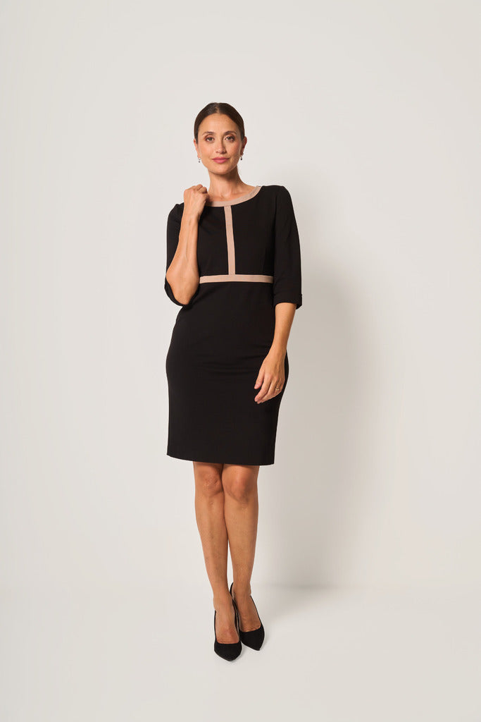DESCRIZIONE: Abito tubino elegante, caratterizzato da un design minimal valorizzato da inserti beige a contrasto sullo scollo e in vita. Il modello presenta maniche a tre quarti, scollatura rotonda e una linea dritta e femminile che esalta la silhouette. Codice prodotto: 260265