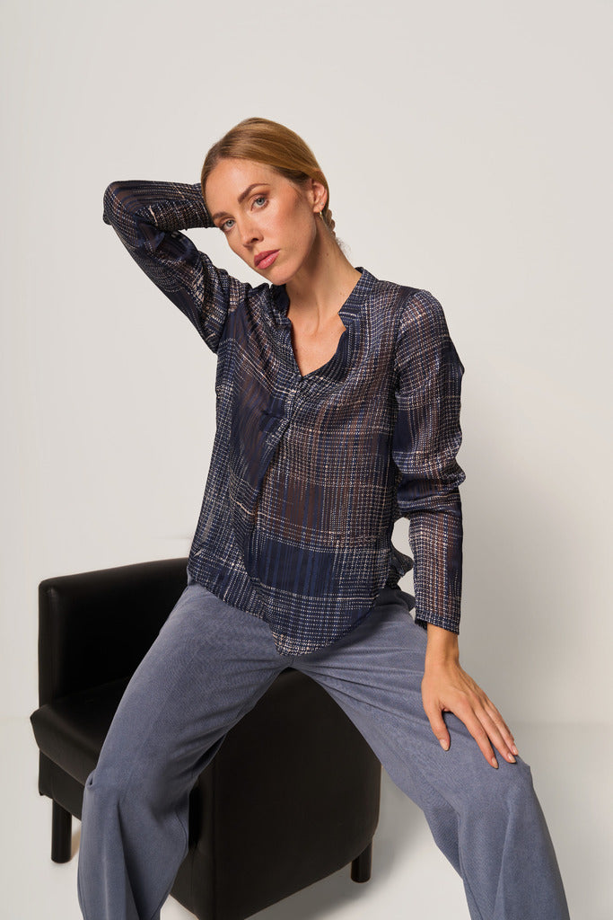 DESCRIZIONE: Camicia da donna in tessuto leggero e semi-trasparente, con fantasia geometrica nei toni del blu e del beige. Il modello presenta scollatura a V con piccolo colletto alla coreana e maniche lunghe. Codice prodotto: 260205