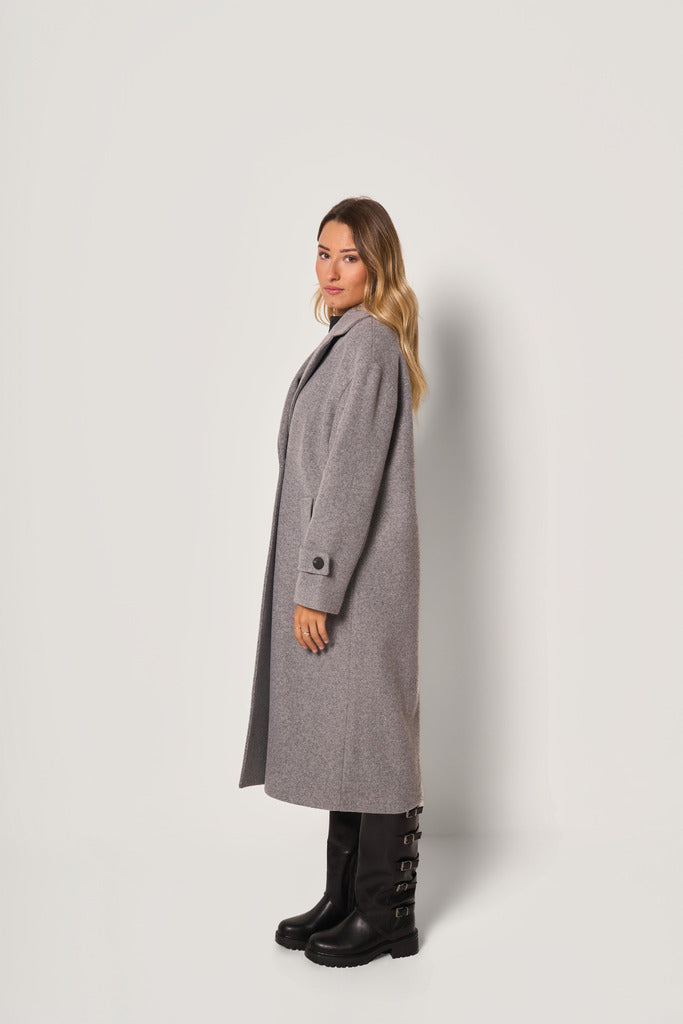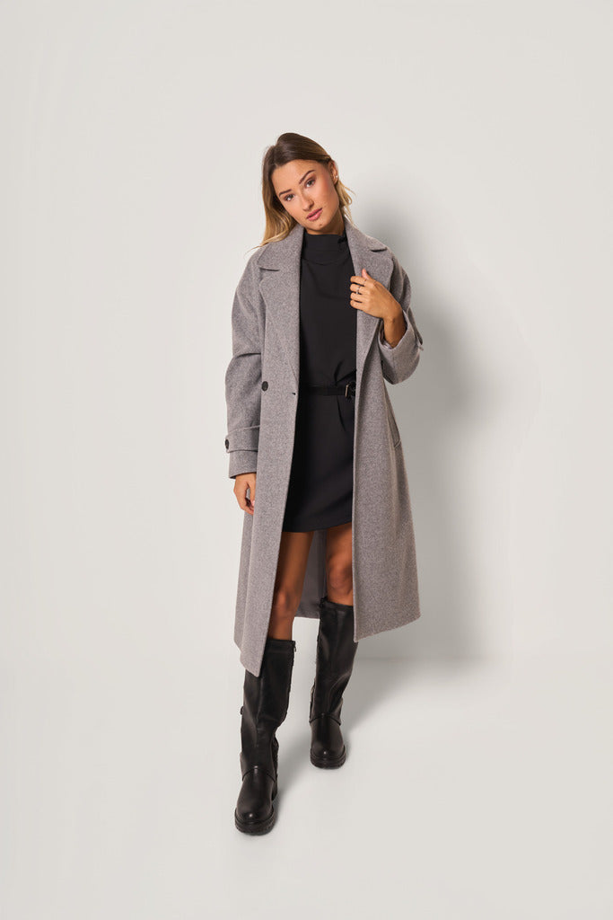 Cappotto lungo, dal design moderno e lineare. Il modello presenta colletto a rever ampio, chiusura doppiopetto con bottoni e tasche laterali a filetto, completato da polsini con cinturino e bottone per un dettaglio raffinato. La vestibilità morbida e il taglio dritto donano eleganza e comfort.