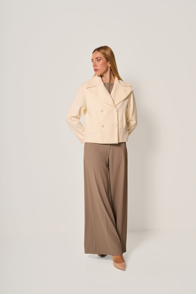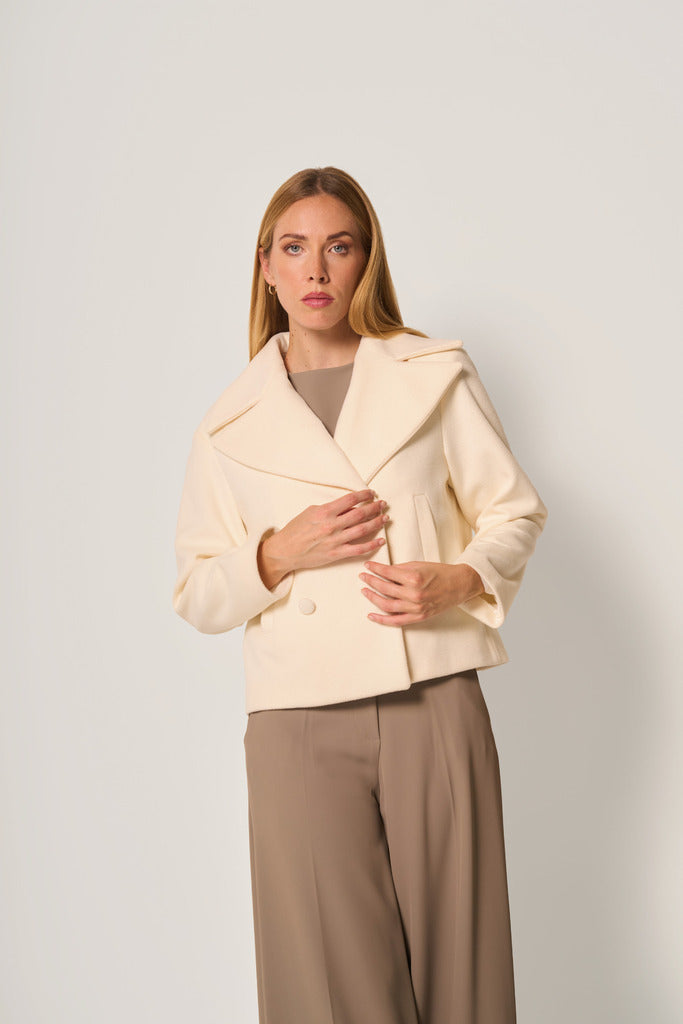 DESCRIZIONE: Giaccone corto in panno caldo e morbido, caratterizzato da un’elegante linea svasata e da un collo ampio a revers. Il modello presenta chiusura doppiopetto con bottoni tono su tono e tasche laterali a filetto, per un look raffinato e contemporaneo. Codice prodotto: 259071
