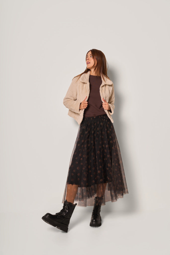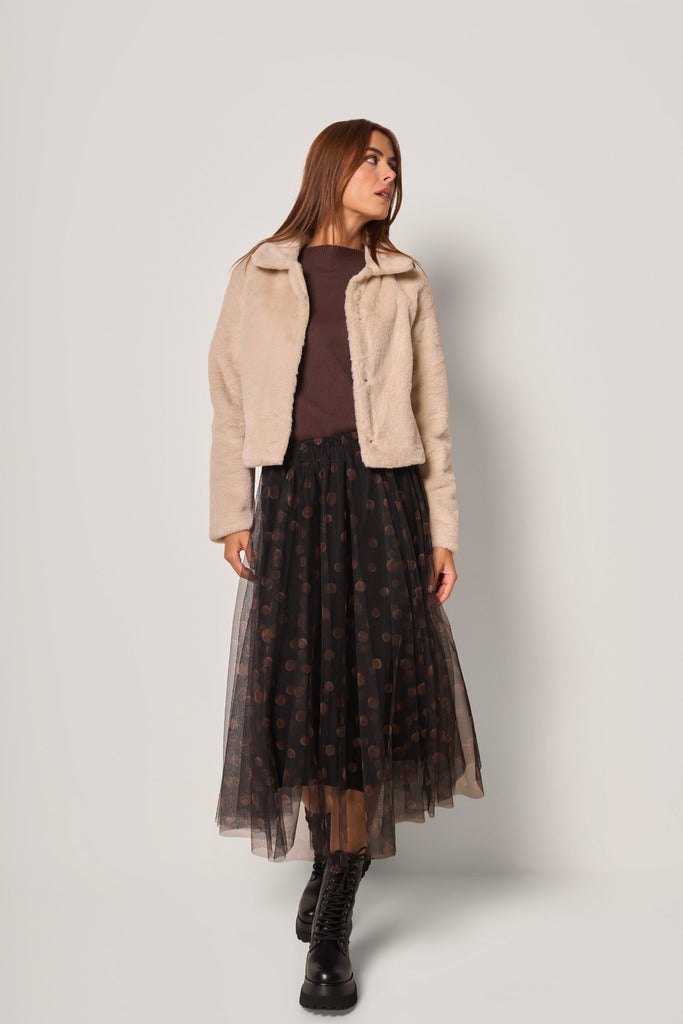 Giacca corta in morbida ecopelliccia, calda e avvolgente, dal taglio moderno e femminile. Il modello presenta colletto classico, chiusura con bottoni automatici e una linea dritta che valorizza la silhouette senza appesantirla.