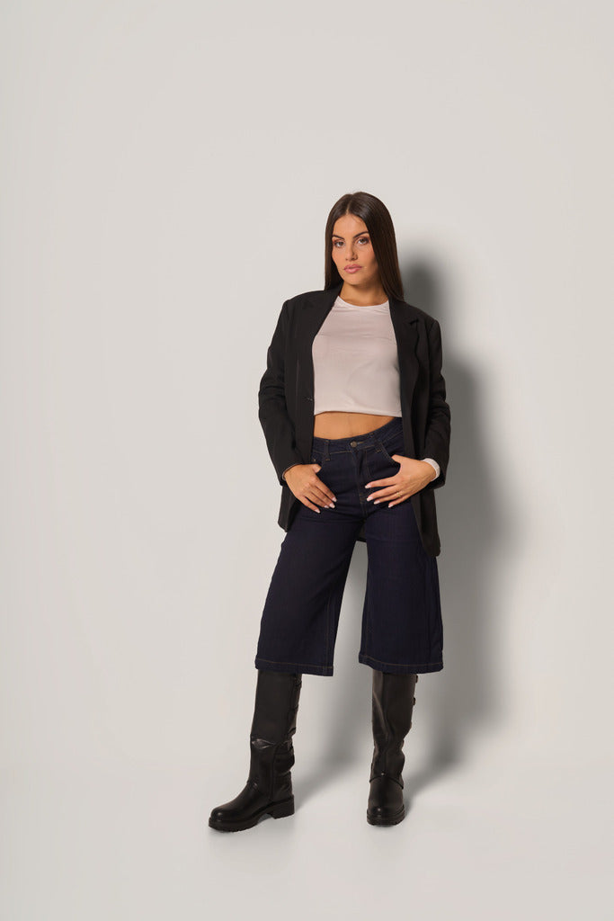 Bermuda in denim, caratterizzati da una linea morbida e lunghezza al ginocchio. Il modello presenta vita media con passanti, chiusura con bottone e zip, e cinque tasche classiche.