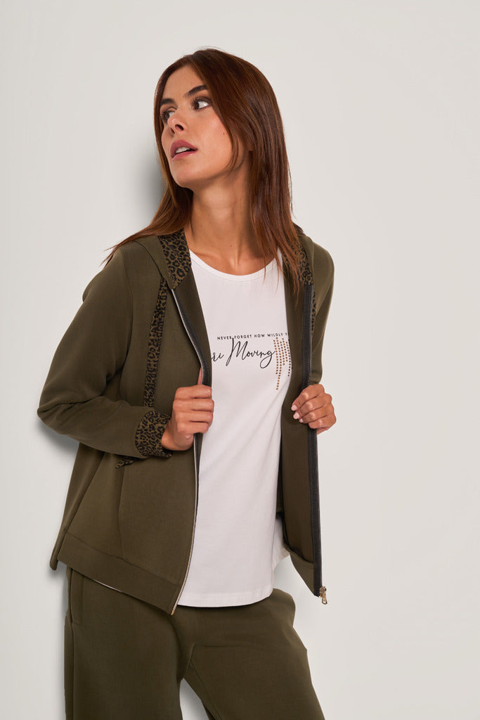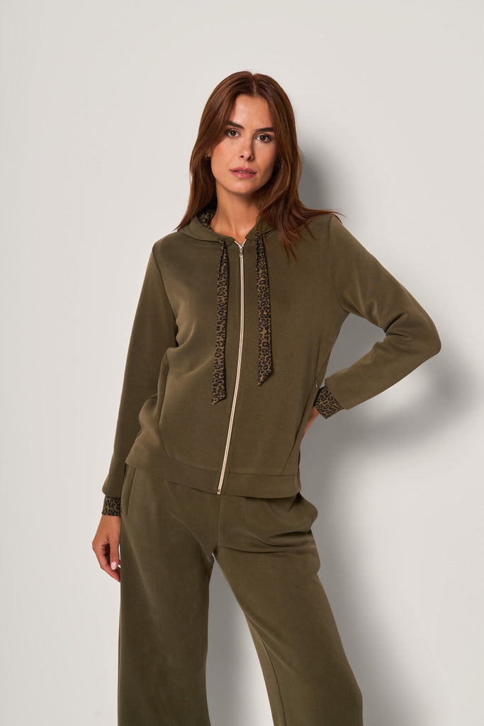 DESCRIZIONE: Felpa da donna in morbido tessuto stretch, dal taglio comodo e femminile. Il modello presenta cappuccio con coulisse decorata in fantasia animalier, chiusura con zip dorata e polsini con interno leopardato a contrasto. Codice prodotto: 260236