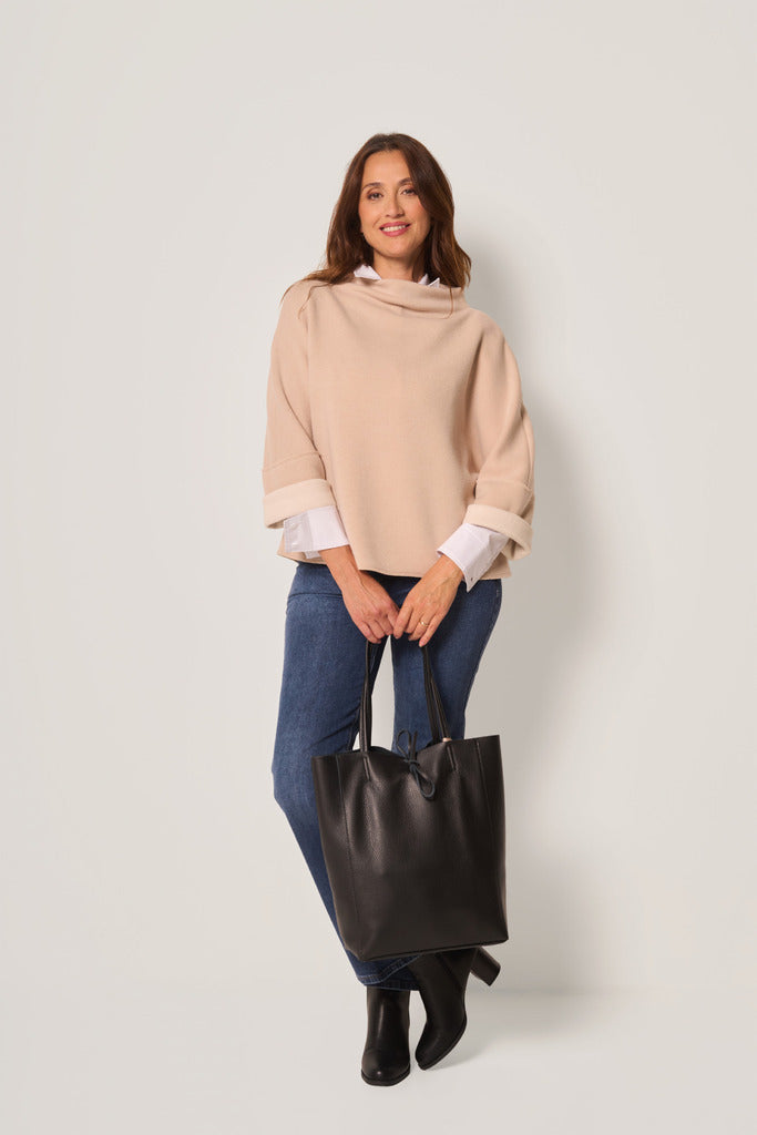 Maglia dal design elegante e minimal, realizzata in morbido tessuto misto viscosa per un comfort avvolgente e una vestibilità fluida. Il modello presenta collo alto morbido, maniche ampie risvoltate e spacchi laterali che donano movimento e femminilità alla silhouette.