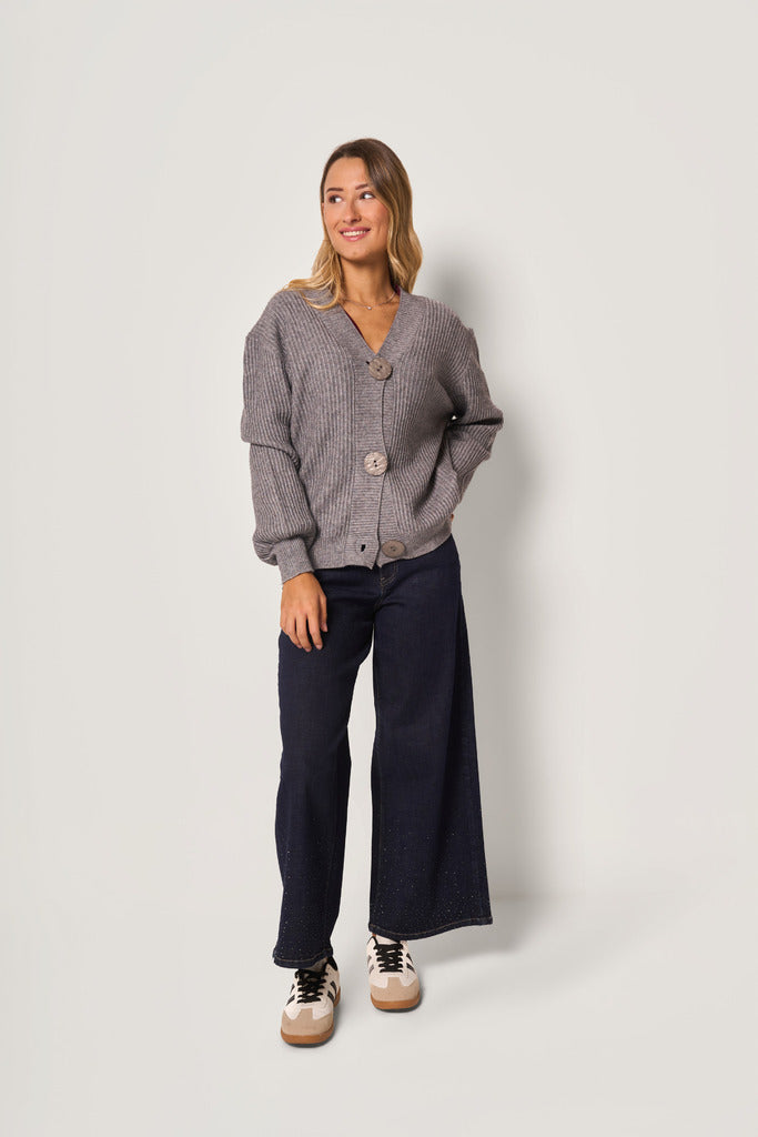DESCRIZIONE: Cardigan in morbida maglia a costine, caratterizzato da una vestibilità rilassata e un design contemporaneo. Il modello presenta scollo a V, maniche lunghe e chiusura frontale con maxi bottoni effetto madreperla. Codice prodotto: 260280
