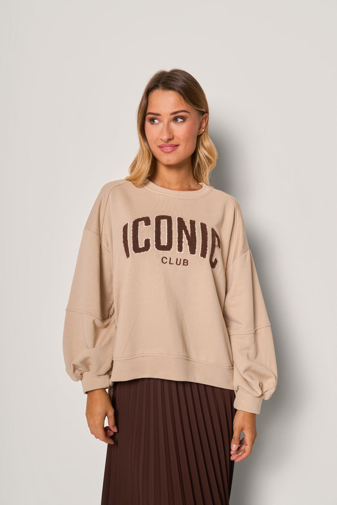 DESCRIZIONE: Felpa girocollo in cotone morbido con lettering frontale “ICONIC CLUB” in rilievo effetto spugna. Il modello presenta maniche leggermente balloon e vestibilità comoda e rilassata, per un look casual. Codice prodotto: 261100