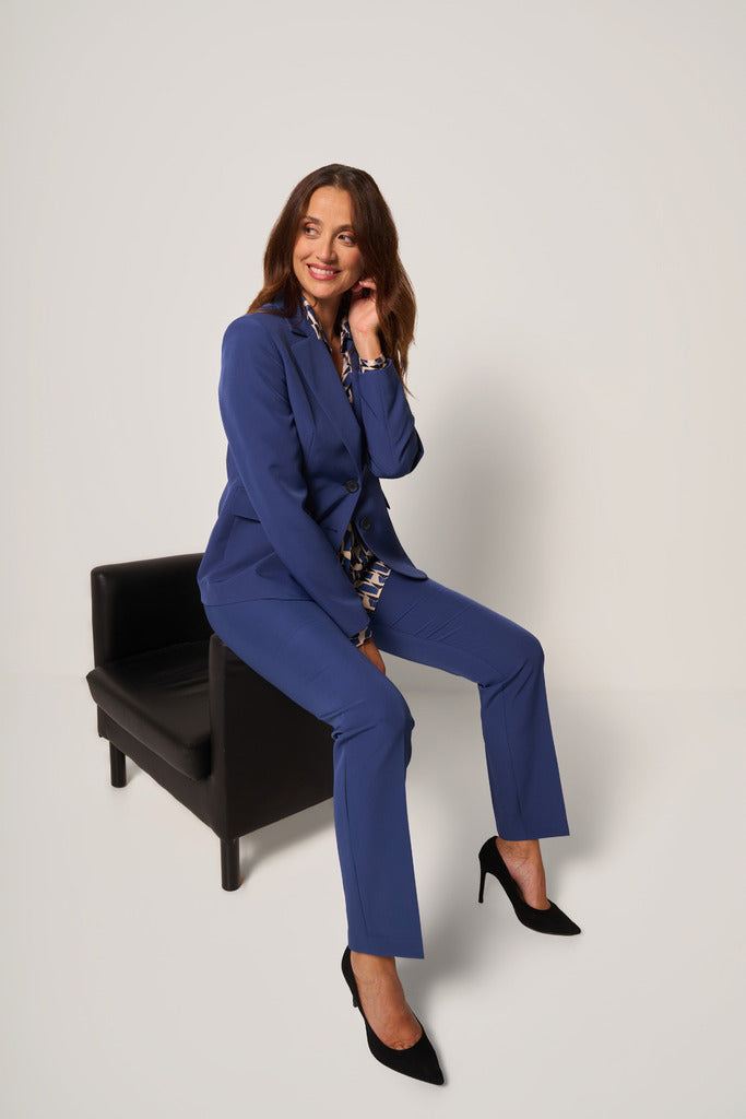 Tailleur da donna composto da giacca monopetto e pantalone dritto, realizzato in tessuto tecnico fluido che garantisce una vestibilità impeccabile e confortevole. La giacca presenta revers classico, chiusura a due bottoni e tasche con patta, mentre il pantalone dal taglio lineare valorizza la figura con eleganza e semplicità.